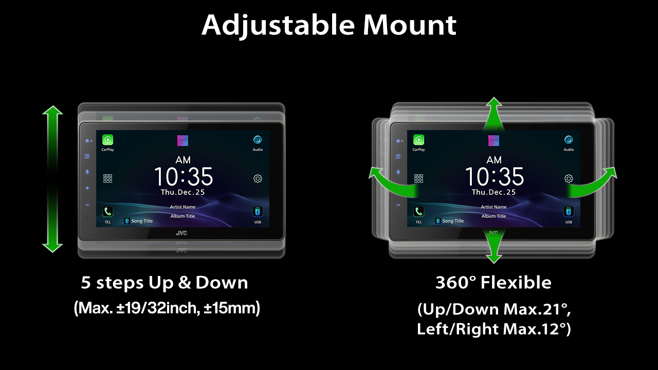 The fully adjustable display allows drivers to rotate and tilt the screen 360, offering easy angle adjustments with tilt, left and right motion for optimal viewing.